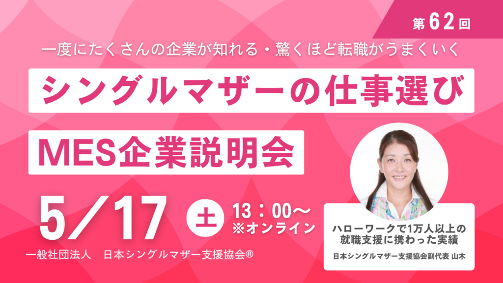 【5/17(土)シングルマザーを応援!教育付き仕事紹介で、あなたのキャリアを支えます!MES企業説明会】
